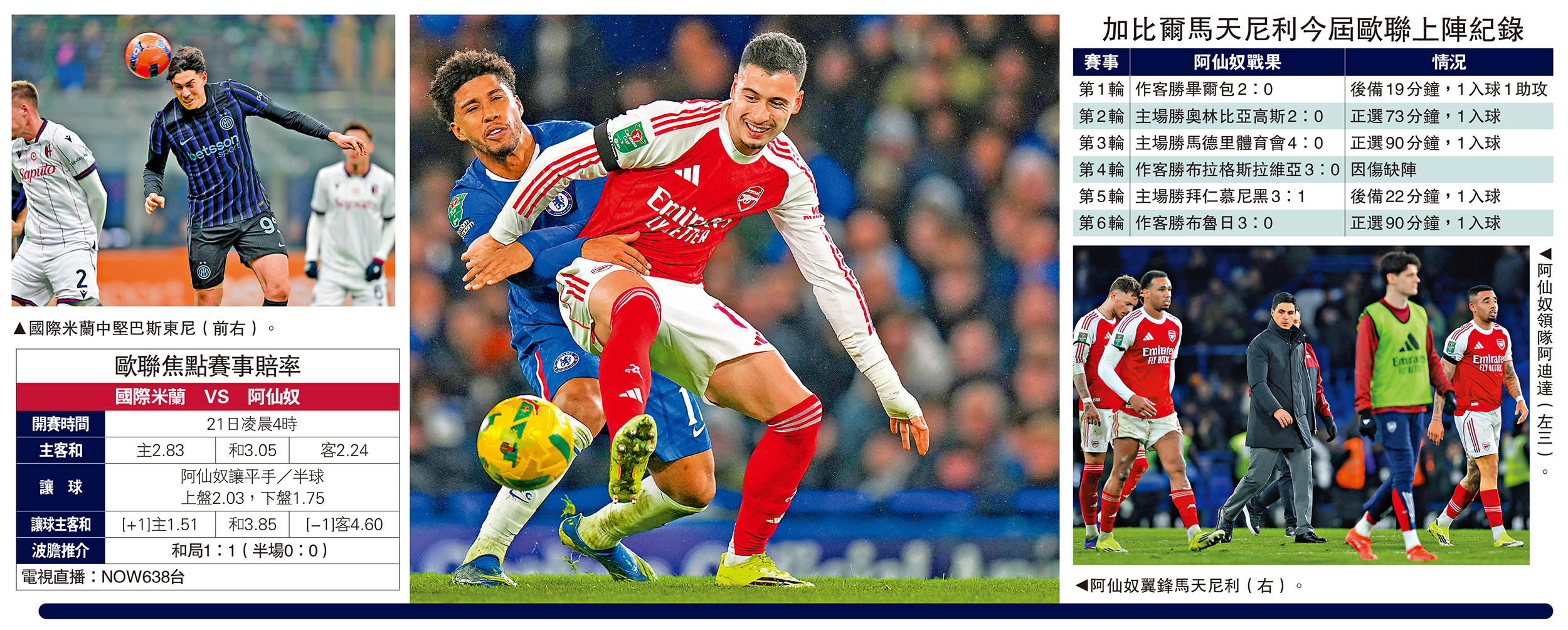 阿仙奴翼鋒加比爾馬天尼利今季大多時間擔任李安度杜沙特的替補,但他在歐聯卻有突出表現,連續在有上陣的5場比賽取得入球,為隊史在歐聯的首人;該名巴西國腳在上場英超浪費了一次黃金機會而間接令球隊失分,並在半場被換走,21日凌晨歐聯第7輪作客大戰意甲領頭羊國際米蘭之役也極可能重回後備席,而國米是繼阿仙奴後暫時失球最少的一隊,若「歐聯殺手」馬天尼利有機會上陣的話,必力爭攻破對方的銅牆鐵壁,助球隊創下歐洲賽7連捷的歷史。\大公報記者 譚德龍