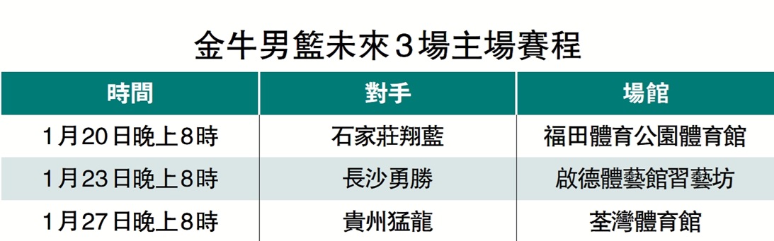 全國男子籃球聯賽(NBL)常規賽第11輪賽事20日晚上8時開打,開季後未逢敵手的香港金牛籃球隊將在主場福田體育公園體育館迎戰石家莊翔藍。金牛上輪作客張家口體文旅以50分之差狂數對手結束「4連客」之旅,今番來到連續3場主場出擊的首戰,即使面對實力接近的翔藍亦不足為懼,預計金牛在主場球迷打氣下可期再次取得大勝。(港台電視32今晚7時54分直播)